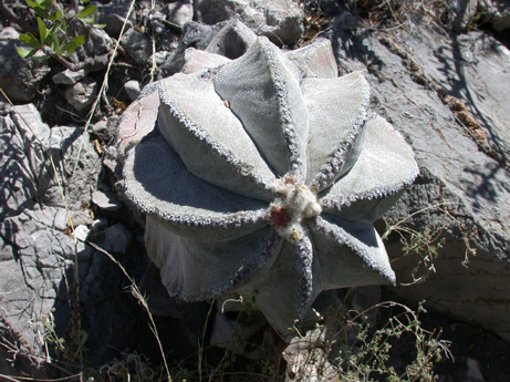 Adultes, vom harten Überlebenskampf gezeichnetes Astrophytum myriostigma subsp. tulenseaus dem Gebiet um Las Flores.