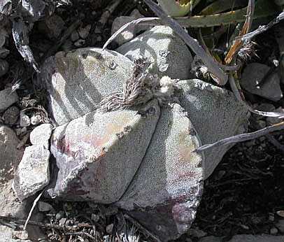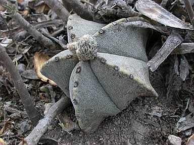 von Astrophytum myriostigma. Exemplare mit dichten weißen Flocken wachsen hier zusammen mit halbnudalen bzw. nudalen Pflanzen