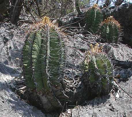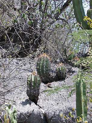 Auf scharfkantigen Kalkfelsen, die Wurzeln tief in einer Felsspalte verankert, so gedeihen diese Exemplare von Astrophytum ornatum