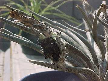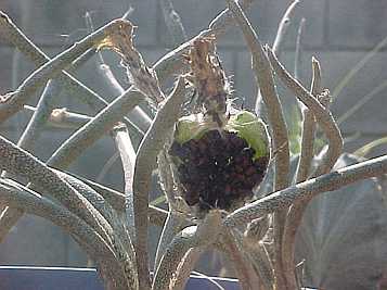 Die Früchte platzen an der Seite auf. Samen und der Blütenrest weisen bei Astrophytum caput-medusae auf eine verwandschaftliche Beziehung zu Astrophytum hin