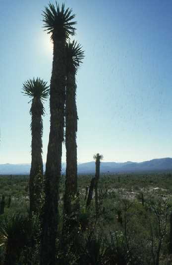 Am Wuchsort von Astrophytum myriostigma var. nudum nördlich Huizache San Luis Potosi. Das Landschaftsbild wird geprägt durch lichte Bestände von unverzweigten Stämmen der prächtigen Yucca carnerosana (Trelease) McKelvey. Man nennt die Pflanzen in ihrer Heimat “palma samandoca”. Foto Heinz Hoock