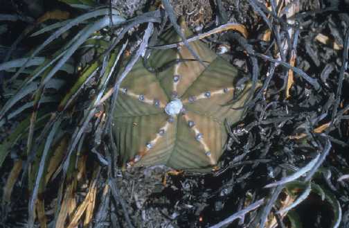 Ein Astrophytum myriostigma var. nudum mit “Querrippen”. Ähnlich auffallende Exemplare findet man gelegentlich auch bei Astrophytum myriostigma und Astrophytum coahuilense.