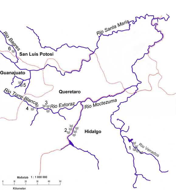 VerbreitungskarteFundorte von Astrophytum ornatum an den Nebenflüssen des Rio Moctezuma