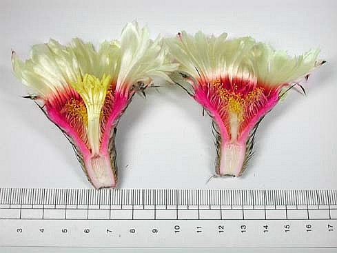 Abb. 1:Schnitt durch eine rotschlundige Blüte von Astrophytum capricorne aus Rinconada, Nuevo Leon, Mexiko. Foto Heinz Hoock