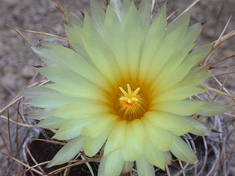 Abb. 5:In Kultur beobachtetes Exemplar mit einer fast rein gelben Blüte. Die Blütenlänge und der Durchmesser sind nahezu identisch mit denen der rotschlundigen Blüten von Astrophytum capricorne.Foto: Klaus-Peter Kleszewski