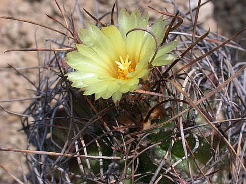 Abb. 6:Astrophytum capricorne v. aureum mit einer rein gelben Blüte, deren Durchmesser 3 cm nicht überschreitet. Eine volle Entfaltung der Blüte ist durch die dichte Bedornung nur selten zu beobachten. Foto: Klaus-Peter Kleszewski